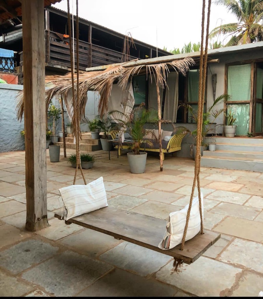 the open cafe is having beautiful interior decorated with small art paintings, antique cornor placed with chairs stars & swing.